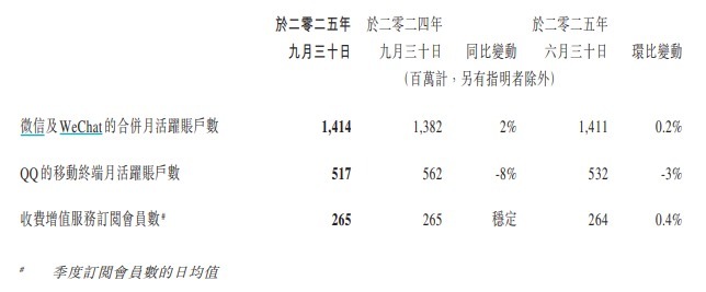 此外。第三季度,微信及WeChat的合并月活跃账户数14.14亿,环比增长0.2%,同比增长2%;QQ的智能终端月活跃账户数5.17亿,环比下降3%,同比下降8%。