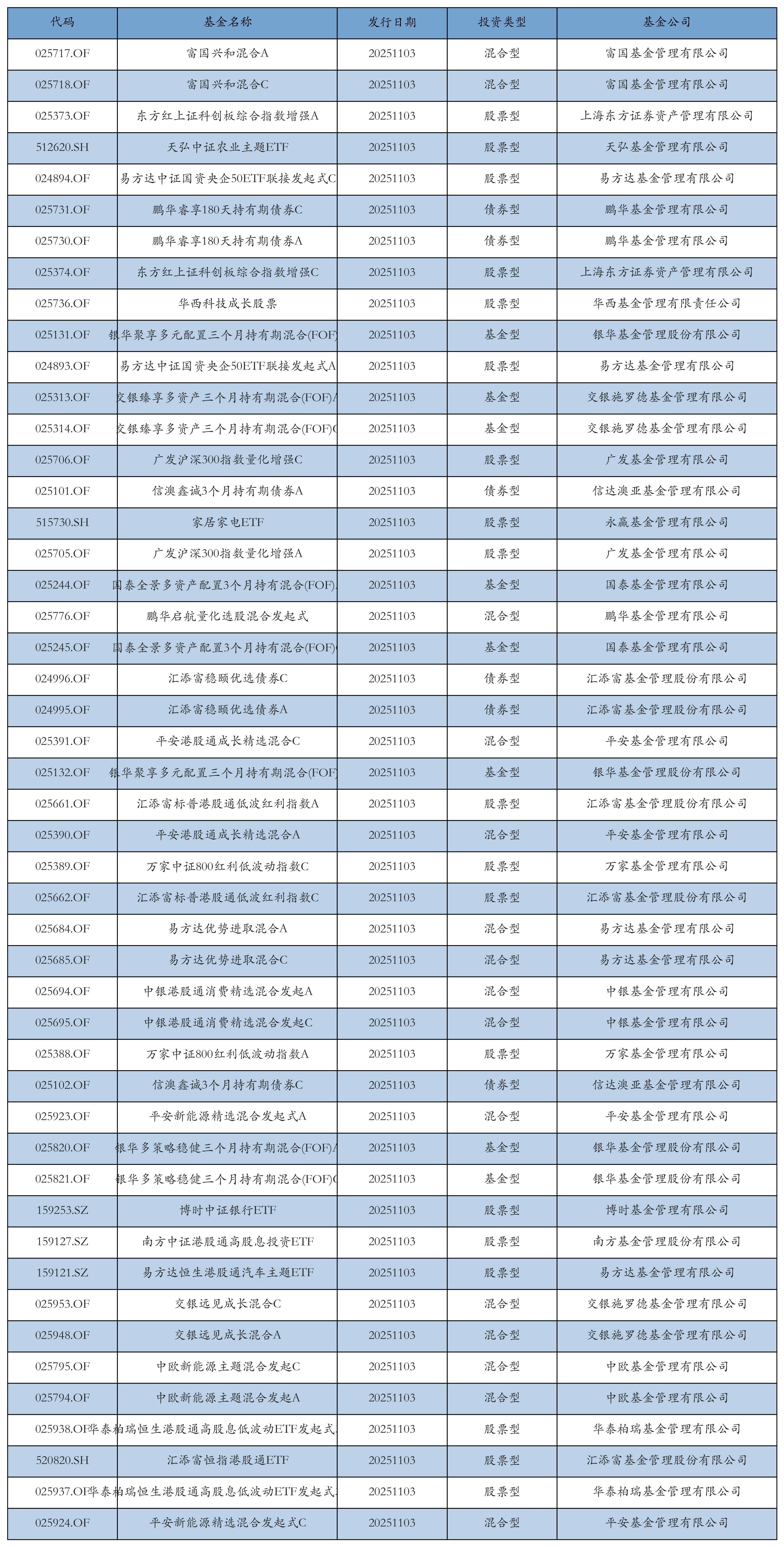 昨日有48只新基金发行,分别为:富国兴和混合A、富国兴和混合C、东方红上证科创板综合指数增强A、天弘中证农业主题ETF、易方达中证国资央企50ETF联接发起式C、鹏华睿享180天持有期债券C、鹏华睿享180天持有期债券A、东方红上证科创板综合指数增强C、华西科技成长股票、银华聚享多元配置三个月持有期混合(FOF)A、易方达中证国资央企50ETF联接发起式A、交银臻享多资产三个月持有期混合(FOF)A、交银臻享多资产三个月持有期混合(FOF)C、广发沪深300指数量化增强C、信澳鑫诚3个月持有期债券A、家居家电ETF、广发沪深300指数量化增强A、国泰全景多资产配置3个月持有混合(FOF)A、鹏华启航量化选股混合发起式、国泰全景多资产配置3个月持有混合(FOF)C、汇添富稳颐优选债券C、汇添富稳颐优选债券A、平安港股通成长精选混合C、银华聚享多元配置三个月持有期混合(FOF)C、汇添富标普港股通低波红利指数A、平安港股通成长精选混合A、万家中证800红利低波动指数C、汇添富标普港股通低波红利指数C、易方达优势进取混合A、易方达优势进取混合C、中银港股通消费精选混合发起A、中银港股通消费精选混合发起C、万家中证800红利低波动指数A、信澳鑫诚3个月持有期债券C、平安新能源精选混合发起式A、银华多策略稳健三个月持有期混合(FOF)A、银华多策略稳健三个月持有期混合(FOF)C、博时中证银行ETF、南方中证港股通高股息投资ETF、易方达恒生港股通汽车主题ETF、交银远见成长混合C、交银远见成长混合A、中欧新能源主题混合发起C、中欧新能源主题混合发起A、华泰柏瑞恒生港股通高股息低波动ETF发起式联接C、汇添富恒指港股通ETF、华泰柏瑞恒生港股通高股息低波动ETF发起式联接A、平安新能源精选混合发起式C,详情见下表: