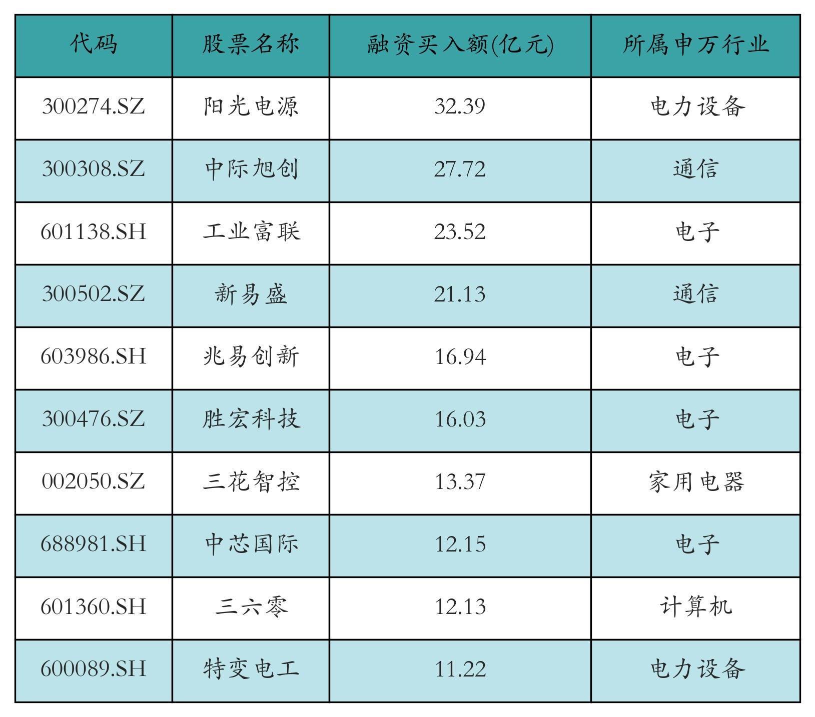 两市共有3455只个股有融资资金买入,其中阳光电源、中际旭创、工业富联排名前三,买入金额分别32.39亿元、27.72亿元、23.52亿元。融资买入额前10个股详情见下表: