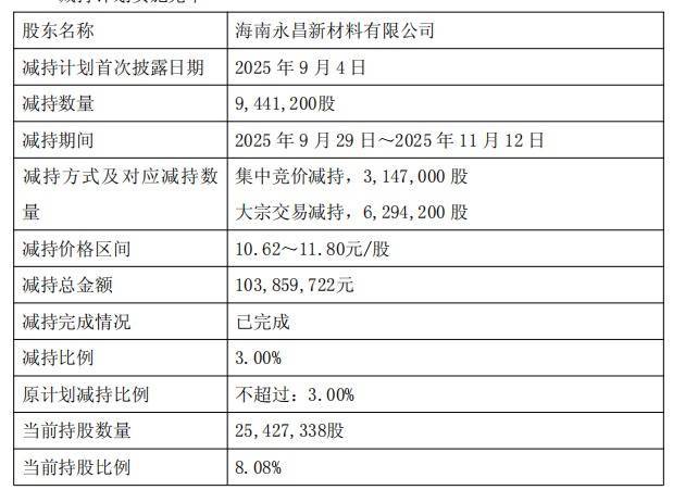 2025年9月29日至2025年11月12日,海南永昌已通过集合竞价交易方式减持其持有的公司股份3,147,000股,占公司减持前总股本比例为1.00%;通过大宗交易方式减持其持有的公司股份6,294,200股,占公司减持前总股本比例为2.00%,合计减持比例占公司减持前总股本比例为3%,减持价格区间为10.62至11.80元/股,减持总金额为103,859,722元。本次减持计划实施完毕。
