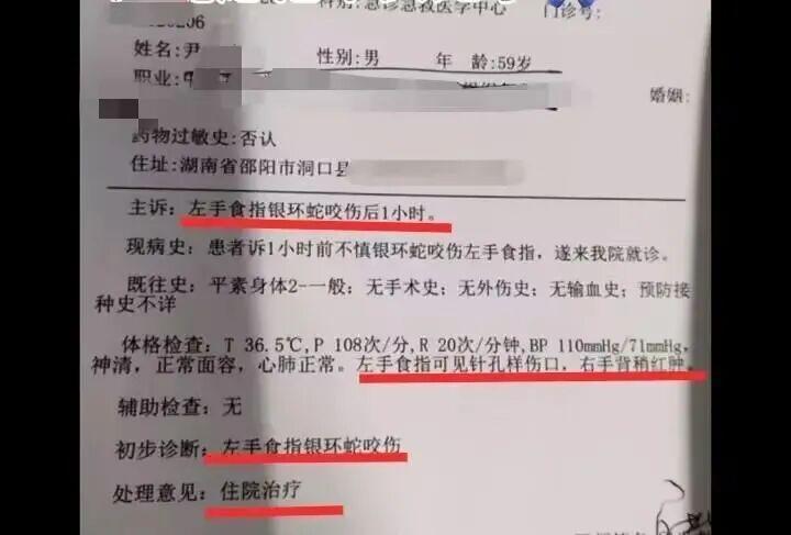 老尹的就诊病历(视频截图)有网友将老尹在洞口县人民医院的急诊病历发布至社交平台,病历主诉左手食指被银环蛇咬伤后1小时;体格检查显示其左手食指可见针孔样伤口,右手背稍红肿;初步诊断系左手食指银环蛇咬伤;处理意见为住院治疗。老尹所在村一位村干部告诉记者,26日事发当晚他就接到老尹被蛇咬伤后下落不明的消息,他们组织了10多人帮忙寻找,但至今没有任何消息。“他在医院检查都做了,之后从医院开车走了,我给他打电话一直关机,到现在都还是关机状态。”该村干部表记者致电洞口县竹篙塘派出所,工作人员证实尹华健是当地人,但对于案件进展工作人员回应“自己不太清楚事情经过,同事都出去了。”洞口县公安局和洞口县交管大队工作人员也表示不知情。来源 三湘都市报 综合极目新闻举报/反馈